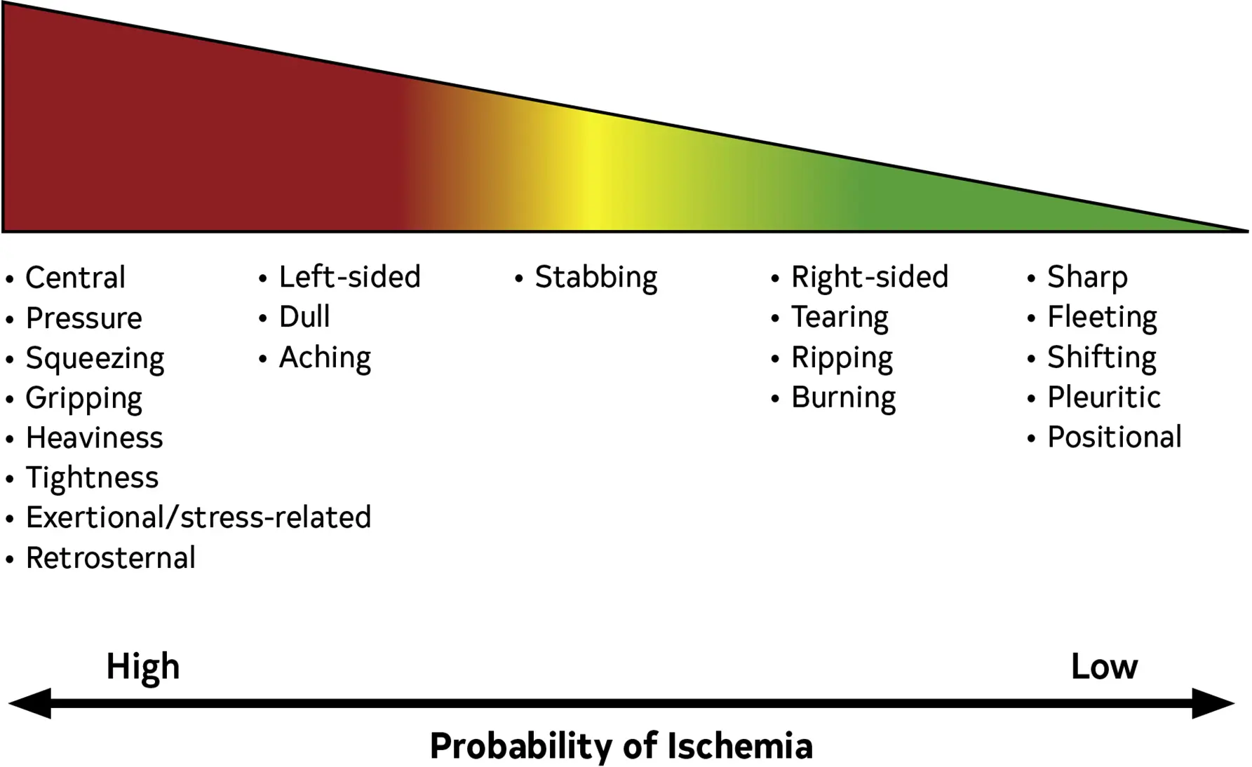 - ⚠️ Avoid the term ‘atypical chest pain’. Instead, use “cardiac,” “possible cardiac,” and “noncardiac” to describe the suspected cause of chest pain1