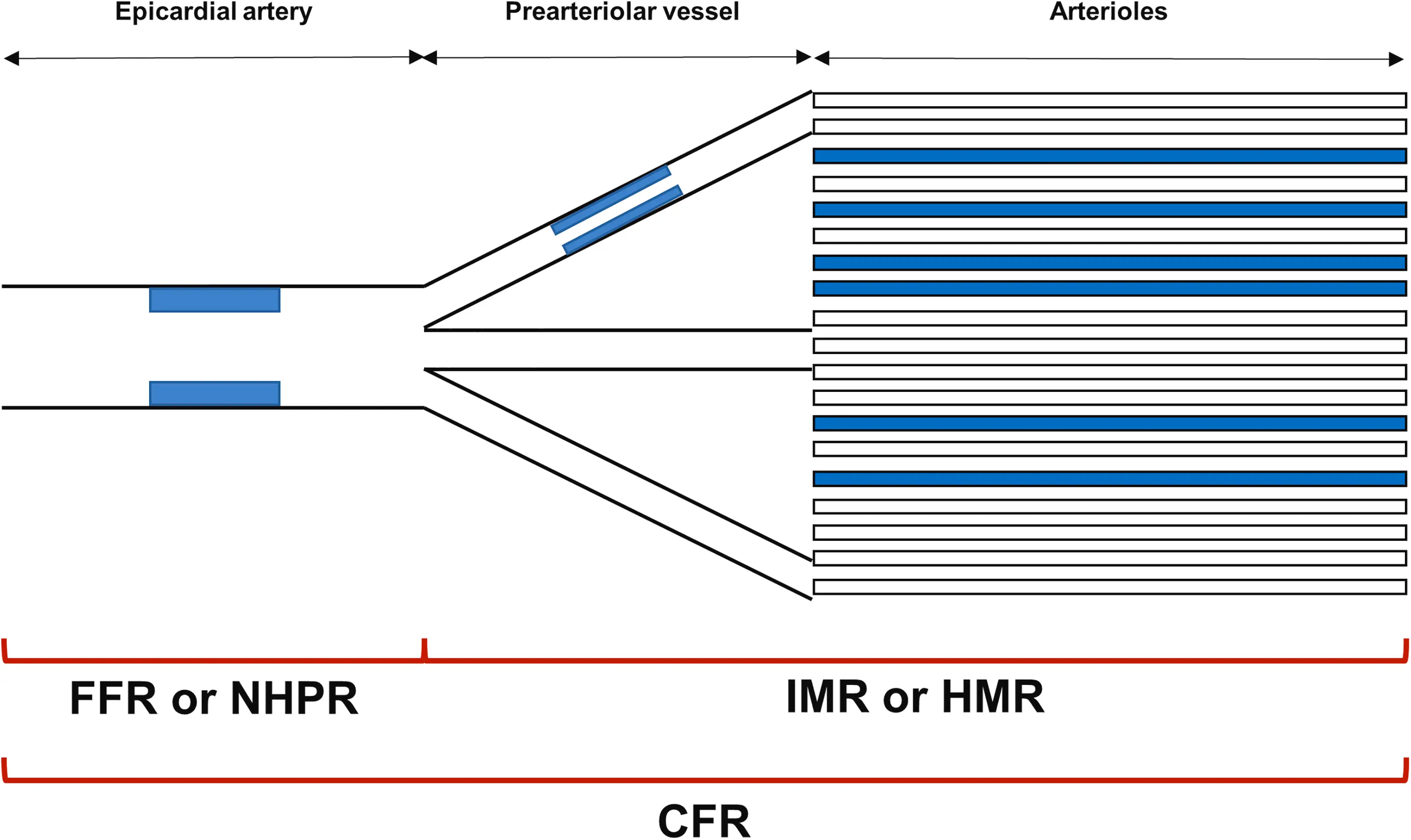 Caption: Invasive physiologic indexes are helpful in identifying the presence of myocardial ischemia and discriminating the mechanisms of myocardial ischemia. Fractional flow reserve (FFR) or nonhyperemic pressure ratio (NHPR) reflects the degree of flow limitation caused by epicardial coronary artery lesions, and the index of microcirculatory resistance (IMR) or hyperemic microvascular resistance (HMR) represents the status of the microcirculatory system. Coronary flow reserve (CFR) is influenced by both macrovascular and microvascular disease status.1
