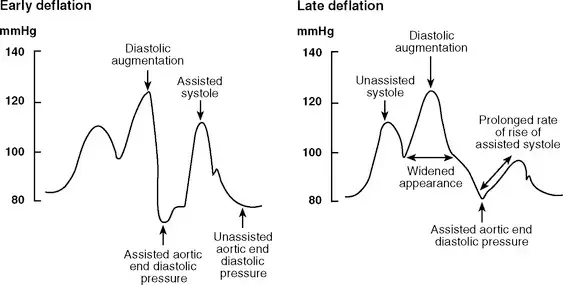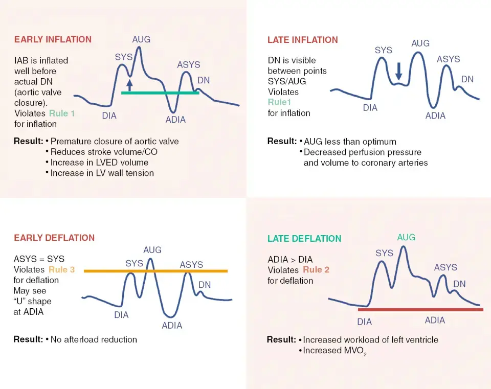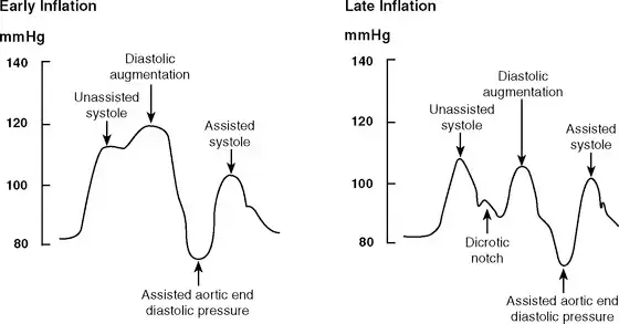 Early/late inflation as well as early/late deflation could lead to suboptimal diastolic augmentation and reduced hemodynamic benefits of the IABP. Timing of IABP is important as too early or too late inflation or deflation can in fact worsen cardiac output and increase preload. (Source) (Source)