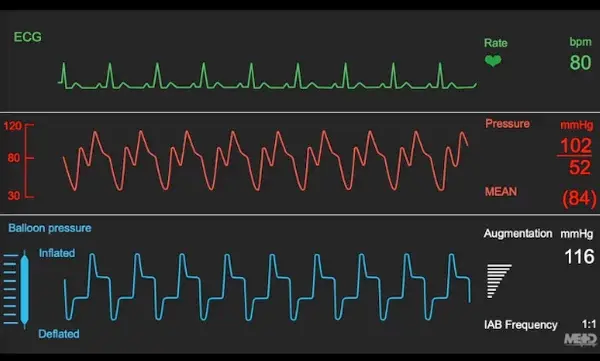 Counterpulsation: The balloon inflates during diastole and displaces the blood in the aorta, increasing diastolic and mean pressure and thus augmenting coronary perfusion. During systole, the balloon deflates, producing some vacuum effect and therefore reducing the afterload for the left ventricle (LV) and systolic pressure. This results in improved emptying of the heart, and therefore reduction of the wall stress of the heart. Other important hemodynamic effects of IABP include: reduction of the heart rate (by 20%), decrease in the pulmonary capillary wedge pressure (by 20%) and rise in cardiac output (by 0.5 L/min or by 20%). The magnitude of the effects can vary and depends on many factors: the volume of the IABP (bigger balloons, 50cm3, displace more volume, hence are more effective), its optimal position (the tip of the IAB should be located 2 cm caudally to the origin of the left subclavian artery which is easily confirmed by chest X-ray as 2 cm above the tracheal bifurcation, i.e. carina), optimal timing of the inflation/deflation cycle, heart rate and aortic compliance. (Source)