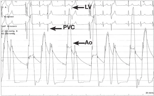 - “After a PVC, there is a compensatory pause that causes an increase in diastolic filling time and ∴ an increase in diastolic volume. The normal physiologic response to increased stretch according to Frank Starling’s Law is to increase stroke volume by an increase in contractility, causing the arterial pulse pressure to rise. In patients with HOCM, the increase in contractility after a PVC worsens the LVOT obstruction, causing a decrease in the arterial pulse pressure and the Brockenbrough-Braunwald-Morrow sign.” 2