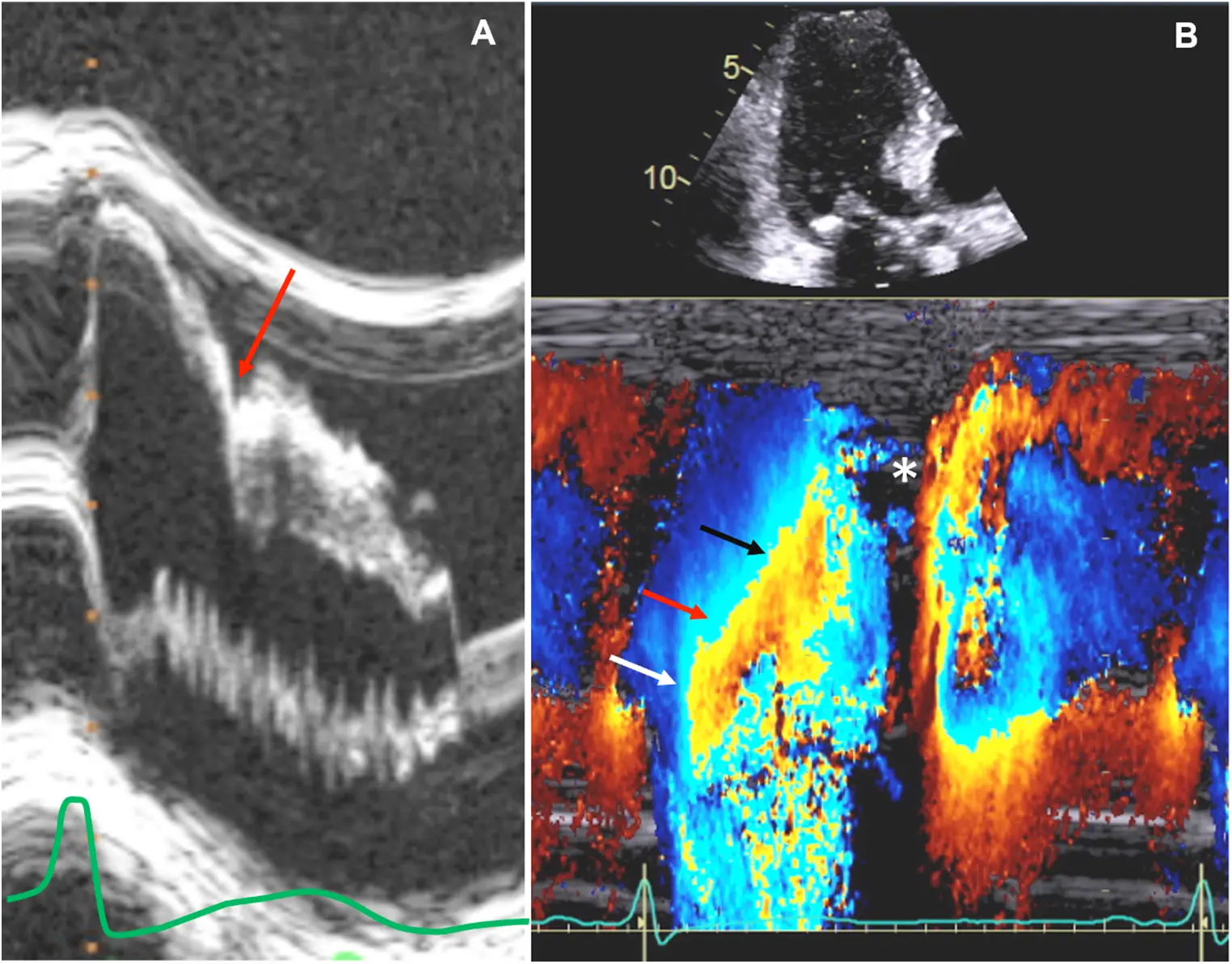 - Color-flow Doppler shows turbulence at mid-ventricular level