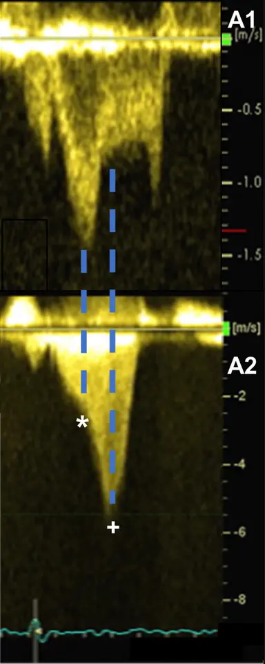 Gradients > 60 mmHg may take on a “lobster claw” pattern 1