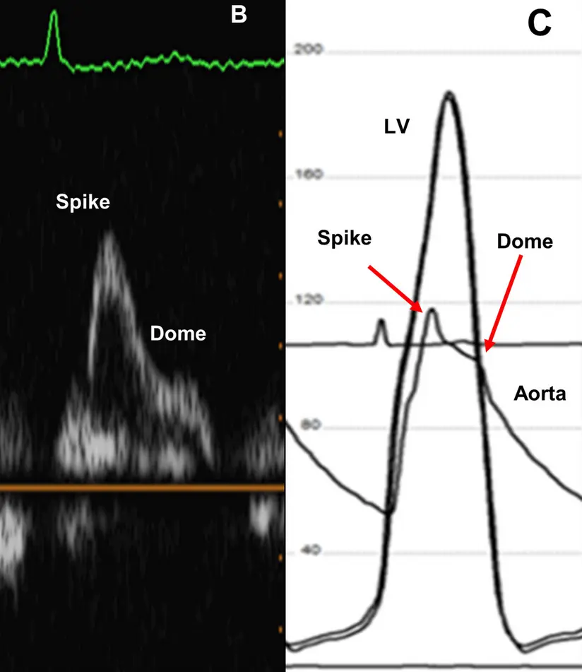 Aortic pressure tracing will also feature the “spike-and-dome” pattern