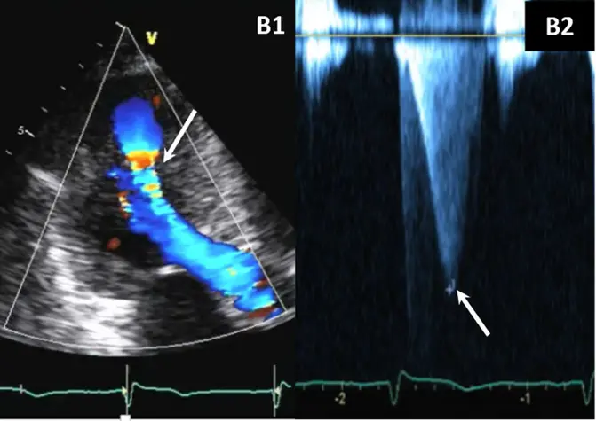 - Posteriorly-directed MR jet (classically): Usually, the anterior and posterior MV leaflets fail to coapt in mid-late systole, due to the upward and anterior motion of the anterior leaflet toward the LVOT, creating a funnel that directs the MR posteriorly through the interleaflet gap.1