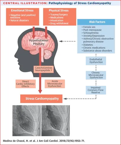 • The typical patient with stress cardiomyopathy is a postmenopausal woman who has experienced severe, unexpected emotional stress in the prior 1 to 5 days. This is often superimposed on a background of elevated levels of stress or anxiety, or an anxiety or panic disorder, but it may also be unheralded.