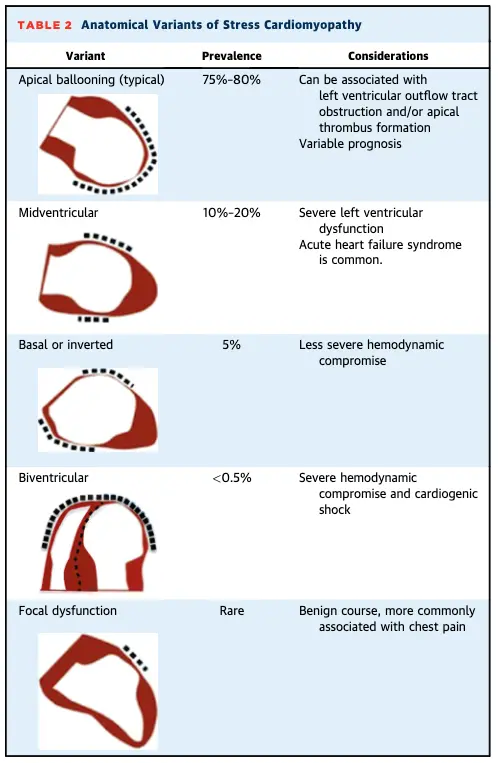 • Other rare variants include biventricular dysfunction and isolated right ventricular (RV) compromise, which are associated with severe hemodynamic compromise and shock, and localized focal dysfunction that are more benign in nature and resemble cases of focal myocarditis