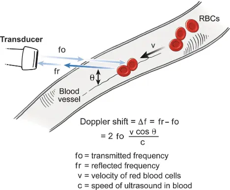 “When an ultrasound beam with known frequency () is reflected by the red blood cells (RBCs) or myocardial tissue, the frequency of the reflected ultrasound waves () increases when the red blood cells or the myocardium is moving toward the source of ultrasound. Conversely, the frequency of reflected ultrasound waves decreases when the red blood cells are moving away from the source. The change in frequency between the transmitted sound and the reflected sound is termed the frequency shift () or the Doppler shift (). The Doppler shift depends on the transmitted frequency (), the velocity of the moving target (), and the angle () between the ultrasound beam and the direction of the moving target as expressed in the Doppler equation.” (Oh, Chapter 4)