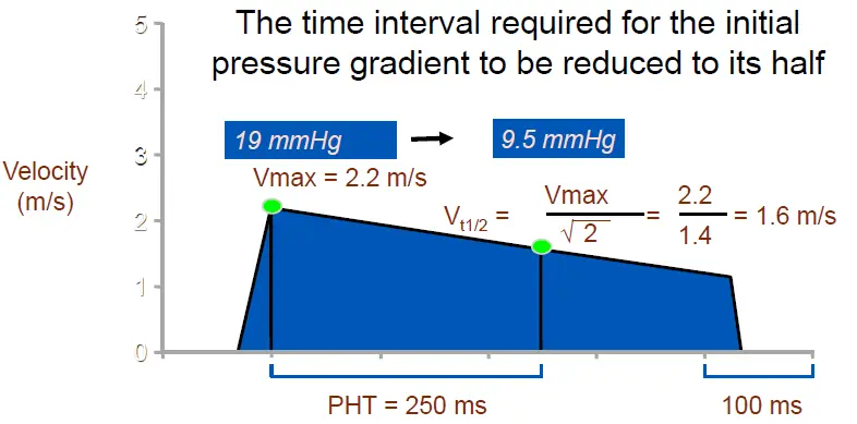 In the following example from the Mayo Board Review course, the initial mmHg. Half of that is 9.5 mmHg. Pressure Half Time (PHT) is the time it takes for the initial pressure gradient to be reduced by half, i.e. the time it takes for the pressure to drop from 19 mmHg → 9.5 mmHg in the provided example.
