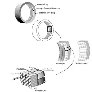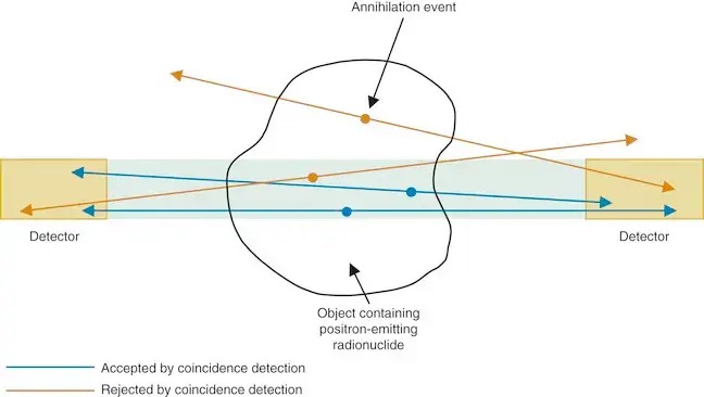 - Because the gamma rays are nearly collinear (discharged at 180° to each other) and travel in opposite directions, the PET detectors can be programmed to register only events with temporal coincidence of photons that strike directly at opposing detectors.