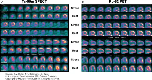 Compared with SPECT MPI, the advantages of PET MPI include improved spatial resolution, better attenuation correction, and lower radiation dose. These advantages are highly relevant in viability images because they allow better identification of the presence, extent, and severity of scar.
