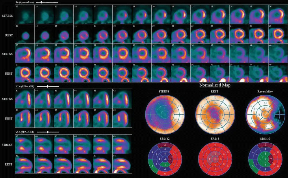 - Rest vs. Stress: If the stress-induced regional perfusion defect persists on the corresponding paired rest images, it suggests the presence of an irreversible myocardial injury. On the other hand, if the defect on the stress images resolves completely or partially on the rest images, it suggests the presence of stress-induced myocardial ischemia.1