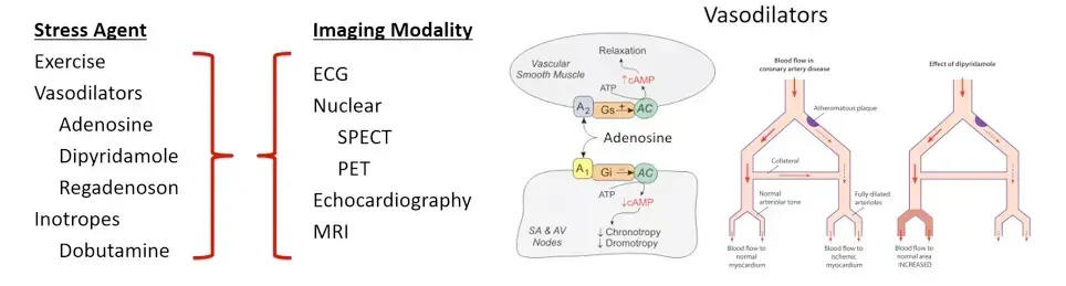 - Most commonly, vasodilators are used to ↑ blood flow to normally perfused areas of the myocardium, uncovering potential areas of decreased perfusion caused by fixed coronary stenoses.