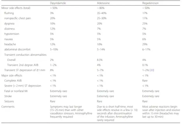 - Off-target effects: Similar potential to adenosine. May have late symptoms after aminophylline reversal agents have worn off.