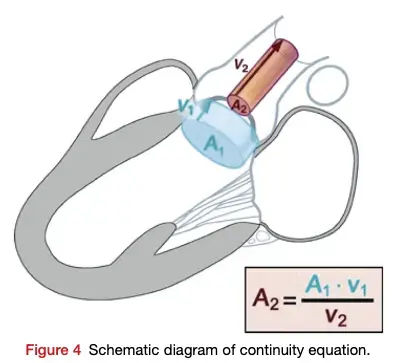 When the valve is tight, the velocity of the blood going through the valve must increase to keep the flow through the LVOT and the aortic valve constant. Recall, , so the velocity has to ↑ when the area is ↓ to maintain the flow rate. Analogy: Think of crimping the water hose while you’re watering your plants. We use the modified Bernoulli equation () to convert the Doppler velocity to pressure gradients across the AV. So as the blood shoots through that tight aortic valve and we clock a velocity of 4 m/s using Doppler on echo, we can convert that to a peak gradient of 64 mmHg, which raises our concern that that poor ventricle is working way too hard.