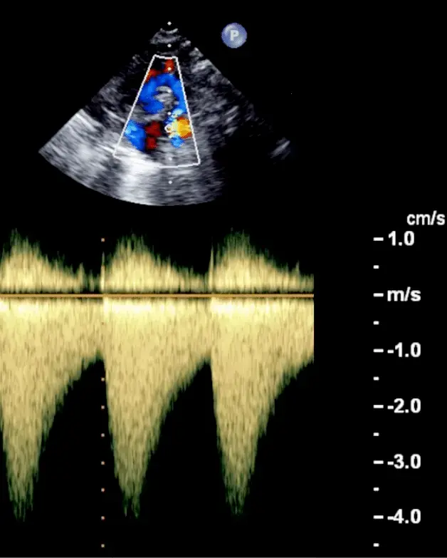 - CW Doppler from Suprasternal Notch view looking at the descending aorta: Sawtooth pattern