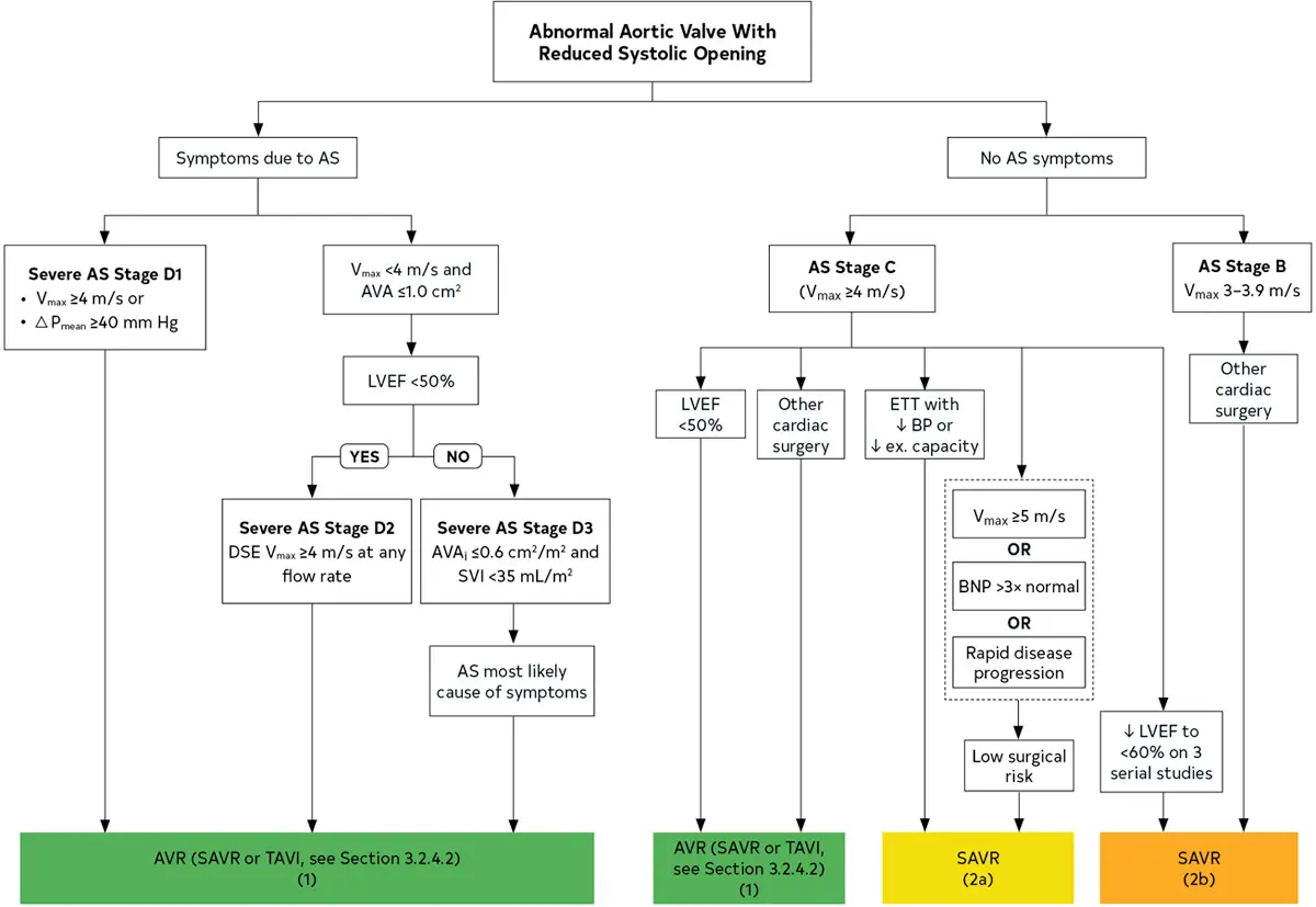- if s/he is noted to have decreased exercise tolerance (normalized for age/sex) or a fall in systolic BP >10 mm Hg from baseline to peak exercise, AVR would be reasonable (Class 2a)
