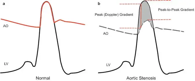 In the normal heart, when the LV starts to squeeze during systole, it generates a pressure that easily plops open the aortic valve when the pressure in the LV meets the pressure in the aorta. When this occurs, the LV and the aorta become so in love that they share the same pressure 🫂 until the LV relaxes and the aortic valve closes, and the romance between the LV and aorta abruptly ends until the next cardiac cycle. ==∴, in the normal situation, the systolic pressure in the LV is the same as the aortic pressure during systole, and there is no pressure gradient.== 1
