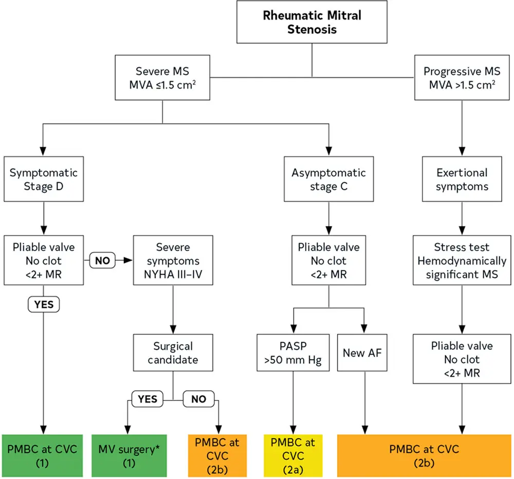 | D | Symptomatic severe MS | Rheumatic valve changes with commissural fusion and diastolic doming of the mitral valve leaflets Planimetered mitral valve area ≤1.5 cm2 | Mitral valve area ≤1.5 cm2 Diastolic pressure half-time ≥150 ms | Severe LA enlargement Elevated PASP >50 mm Hg | Decreased exercise tolerance Exertional dyspnea |
