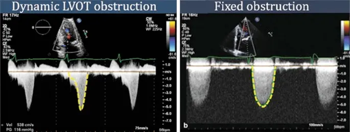 • Dynamic LVOTO (late-peaking, dagger-shapped Doppler signal → HCM